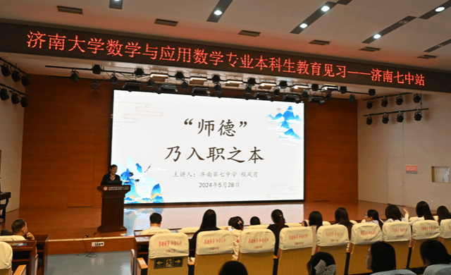 此次活动还是数学与应用数学专业本科生的一次教育见习活动。揭牌仪式之后,程凤霞老师为来访的数学与应用数学专业本科生做了题为《“师德”乃入职之本》的讲座,结合具体案例,从爱国守法、爱岗敬业、关爱学生、教书育人、为人师表、终身学习等六个方面,分享了自己对于师德养成的认识和做法。程凤霞老师通过随机采访、榜样案例、教育妙招等系列形式,幽默生动地阐述了一位好老师的具体标准,让大家体会到了高尚的师德对教育工作者的意义和重要性,获得与会者的高度认同。讲座后,李静主任带领济南大学的师生参观了济南七中校园。