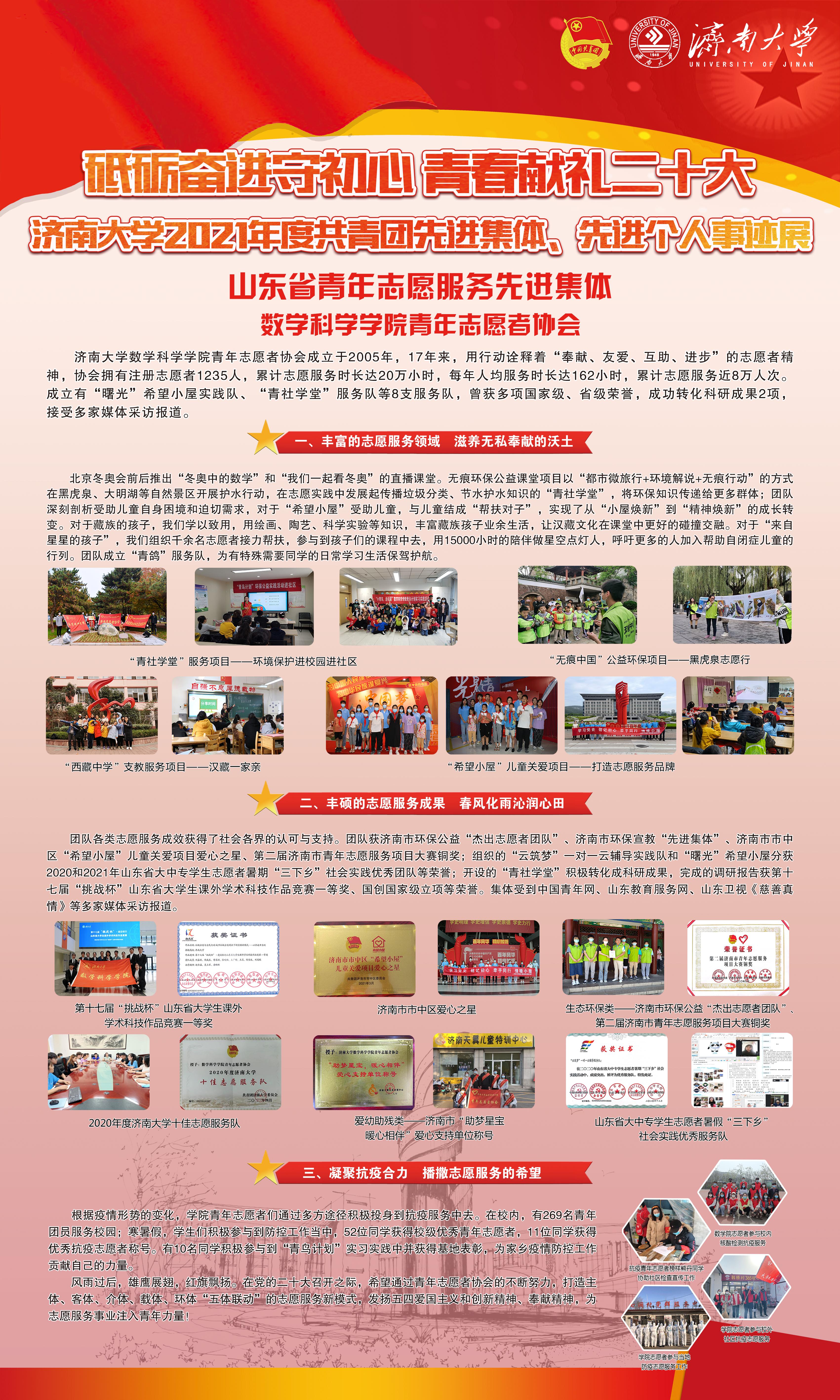 学院青年志愿者协会成立于2005年,协会成立有“曙光”希望小屋实践队、“青社学堂”服务队、西藏中学支教服务队等10余支服务队,拥有注册志愿者1235人,累计志愿服务时长近20万小时,每年人均服务时长达162小时。曾多次获山东省大中专学生志愿者暑期“三下乡”社会实践优秀团体、济南市市中区“希望小屋”儿童关爱项目爱心之星、济南市环保公益“杰出志愿者团队”、济南市环保宣教“先进集体”、济南市青年志愿服务大赛铜奖和济南大学十佳志愿服务队等荣誉。受到中国青年网、山东教育服务网、今日头条、山东卫视《慈善真情》等多家媒体采访报道。